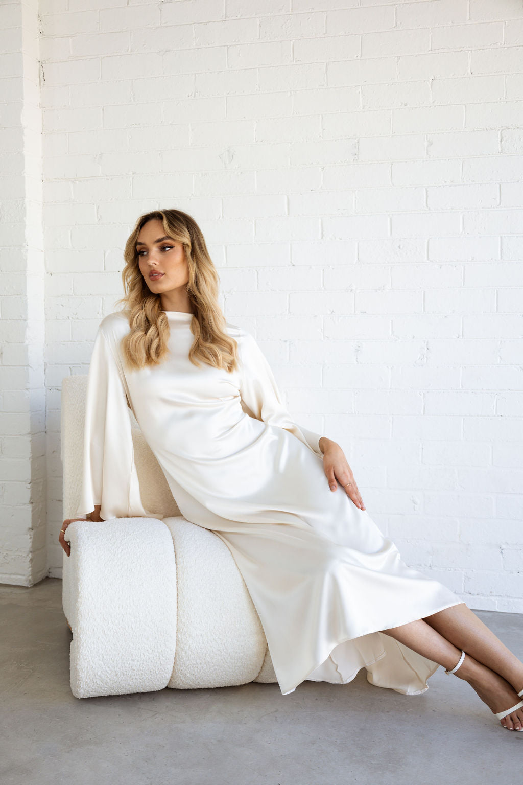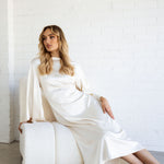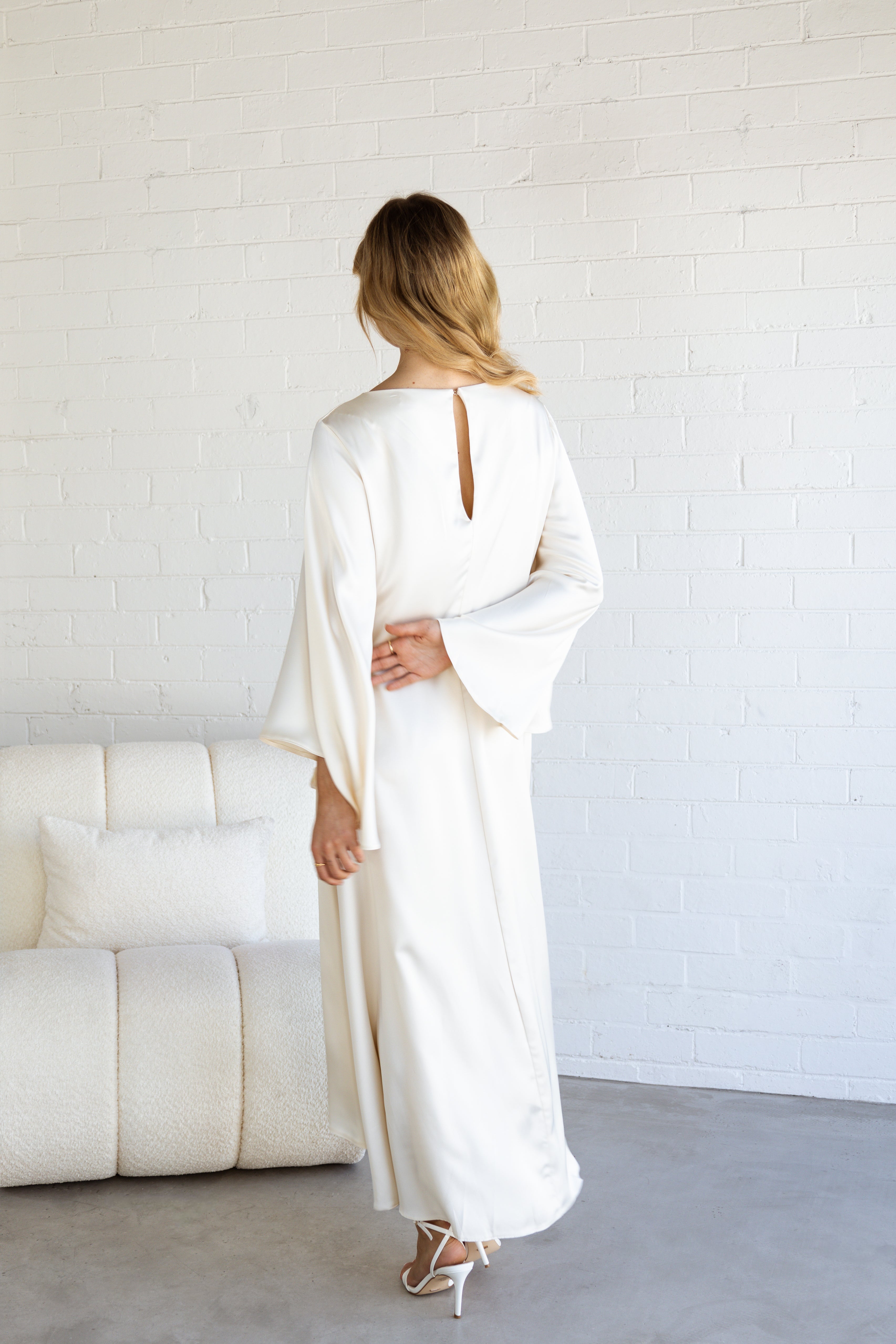 Flowy fabric. Satin. Long design. Evasé design. Rounded neck. Long flared sleeve. Button fastening at back. Opening at the back of the neck. Garment Length 118 cm. Party and events collection.