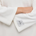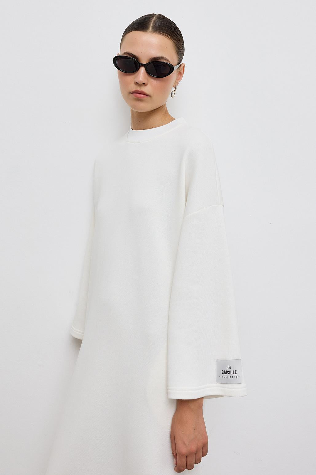 A perfect blend of comfort and contemporary style. This dress features a classic crew neck and Japanese sleeves, adding an element of effortless sophistication to your look. The inclusion of practical pockets ensures both style and functionality. With a unique T-cut design and a sleeve end adorned with a Capsule woven label, this dress stands out as a fashion-forward choice.