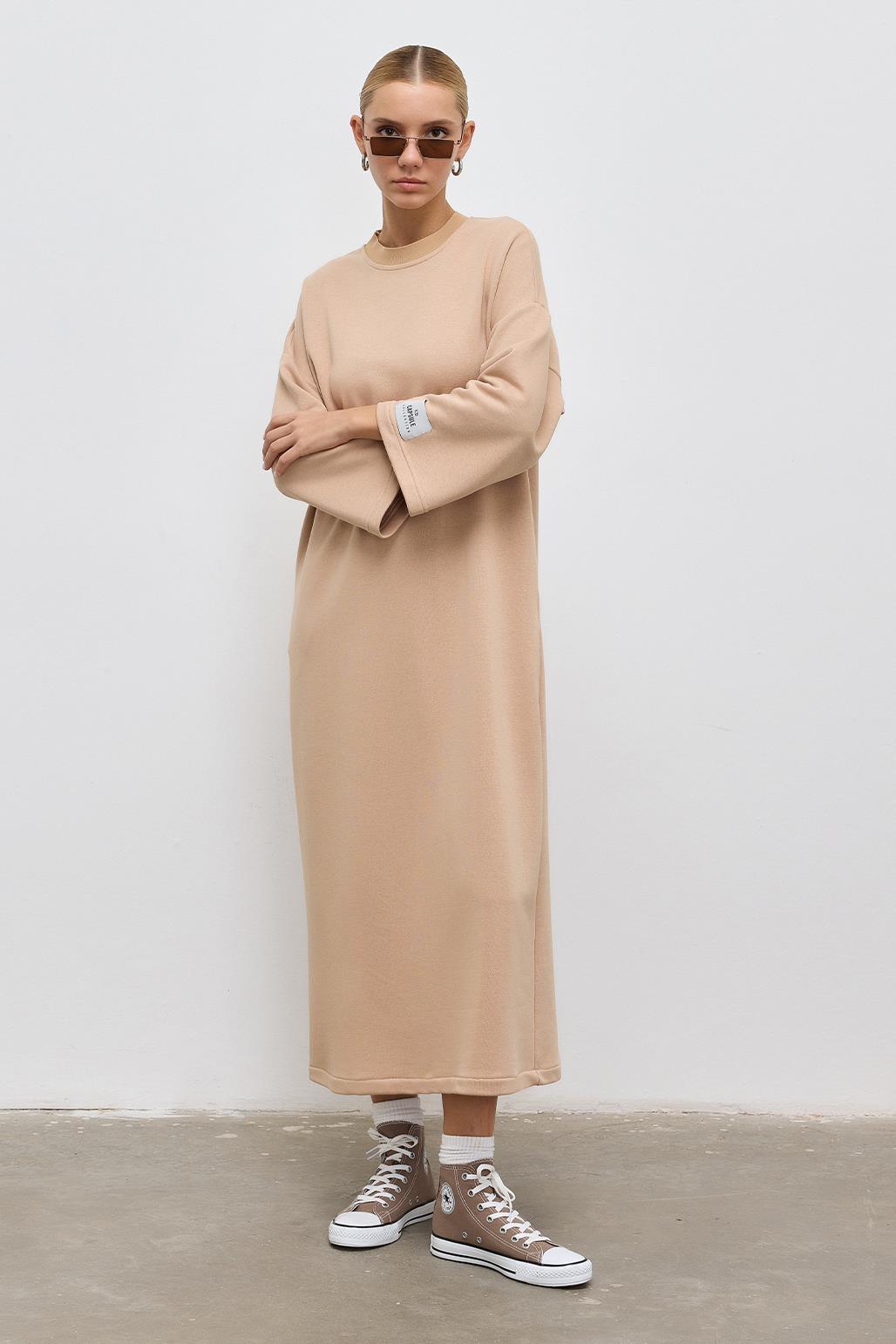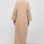 A perfect blend of comfort and contemporary style. This dress features a classic crew neck and Japanese sleeves, adding an element of effortless sophistication to your look. The inclusion of practical pockets ensures both style and functionality. With a unique T-cut design and a sleeve end adorned with a Capsule woven label, this dress stands out as a fashion-forward choice.